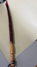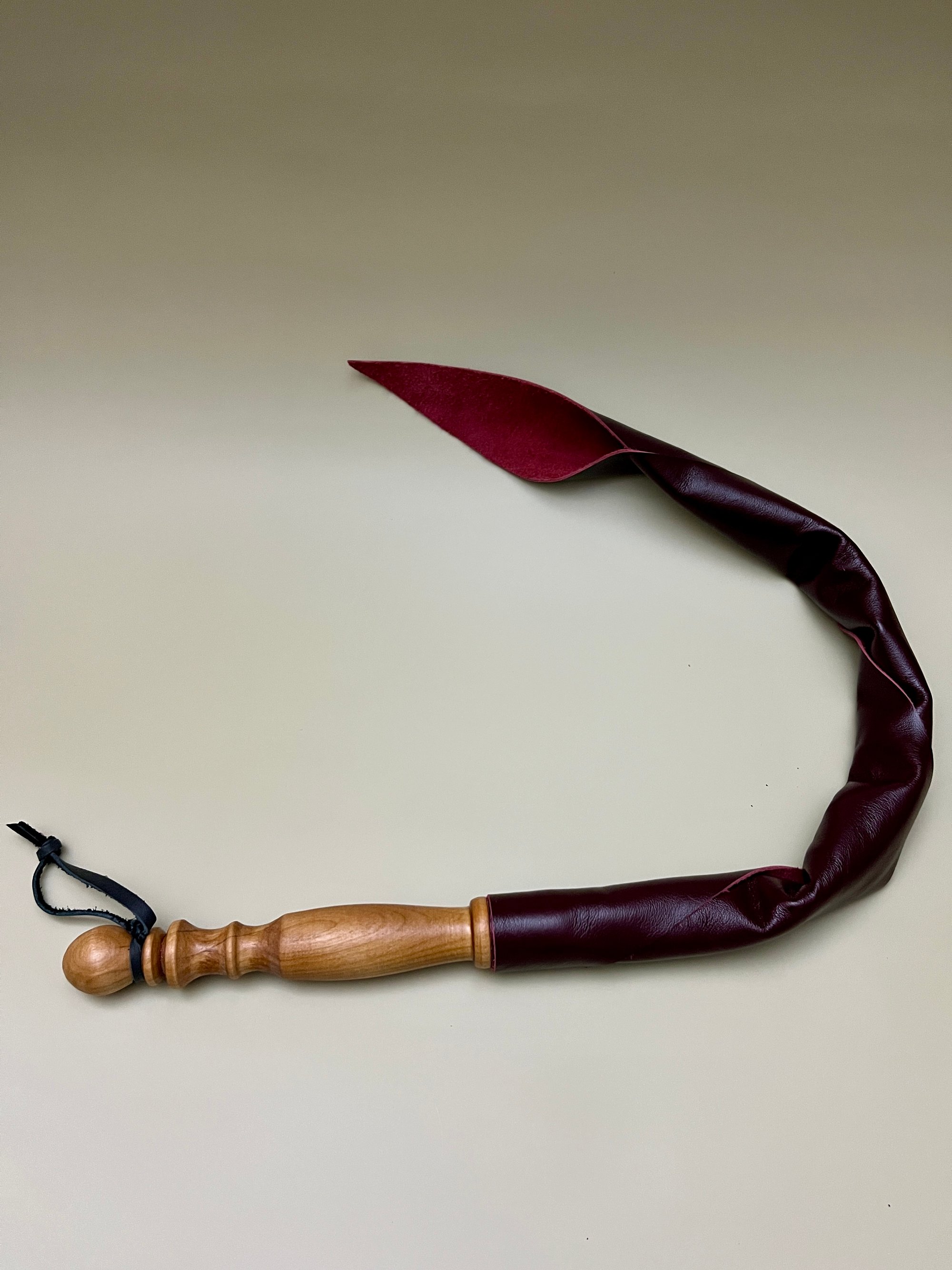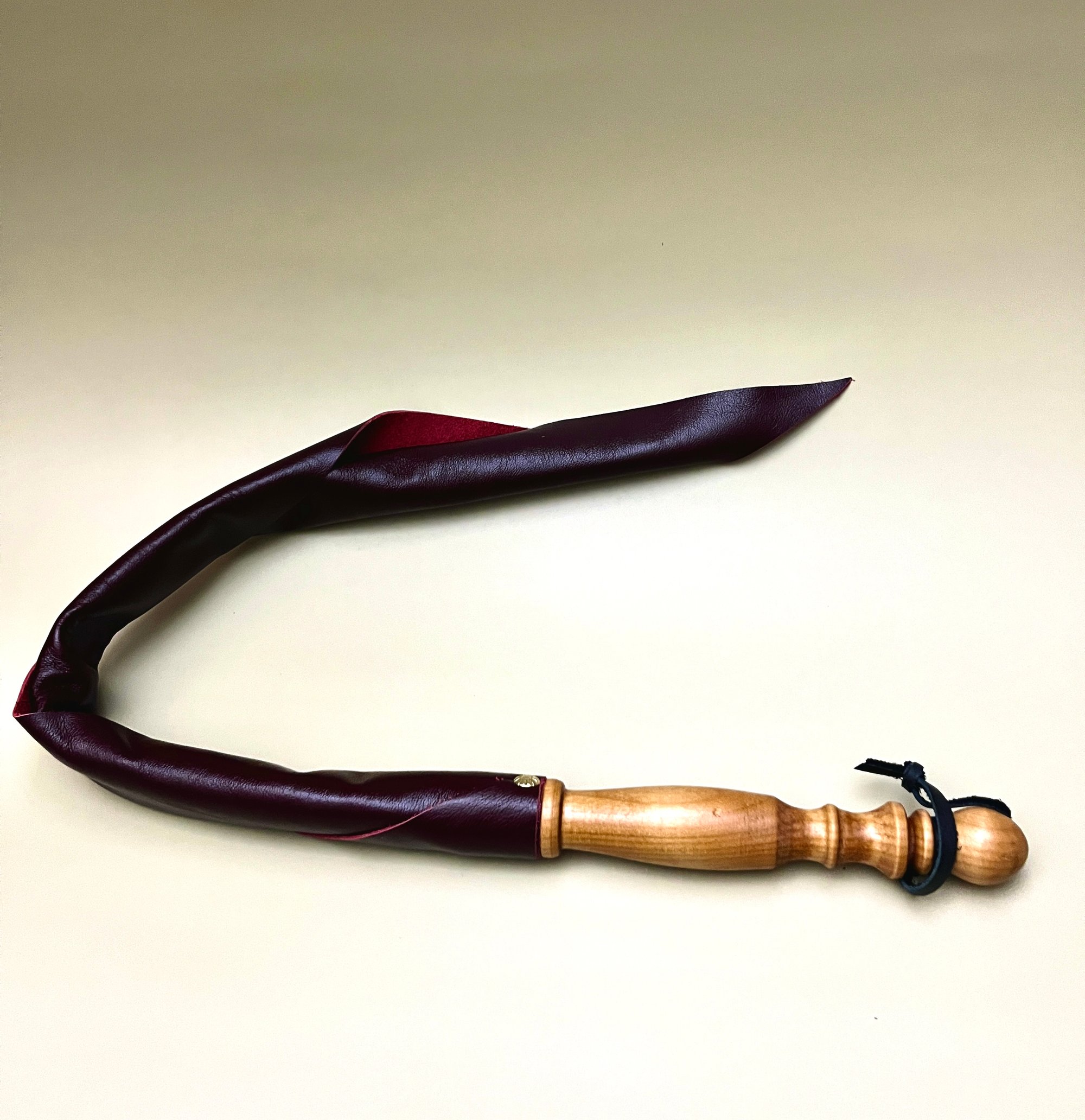 Dragon tails are a style of whip made out of twisted leather. This one is the beautiful dark red, genuine leather. I turned the wooden handle on my lathe out of a repurposed straight table leg! This toy can be thrown straight like a whip for a sting, or folded and held with the point and the handle in the same hand to be used as a more thuddy implement.