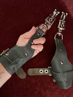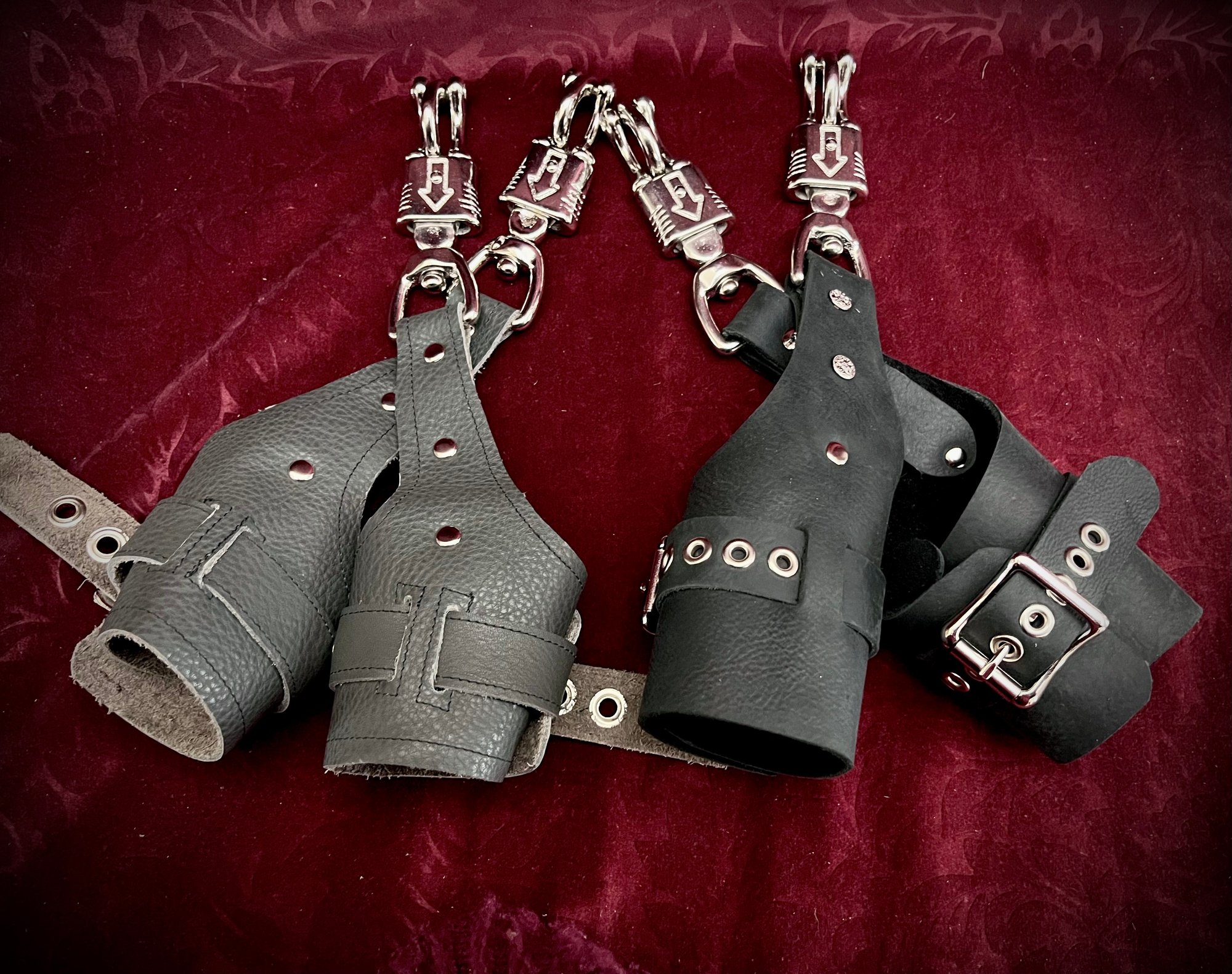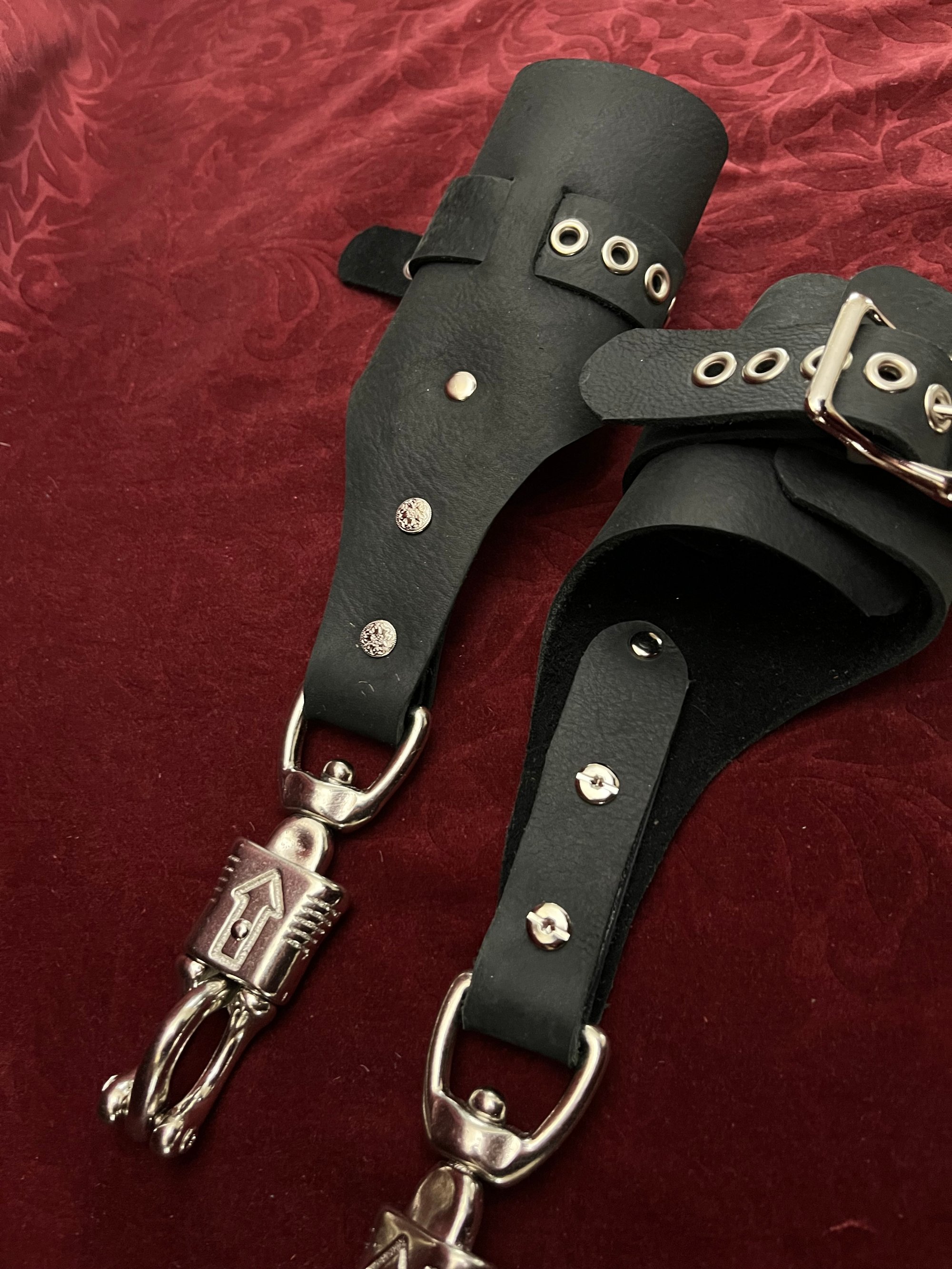 Genuine leather Wrist Restraint cuffs with quick release panic snaps. * Not intended for suspension, the leather strap that goes across your palm is intended to be held onto or “gripped.”
