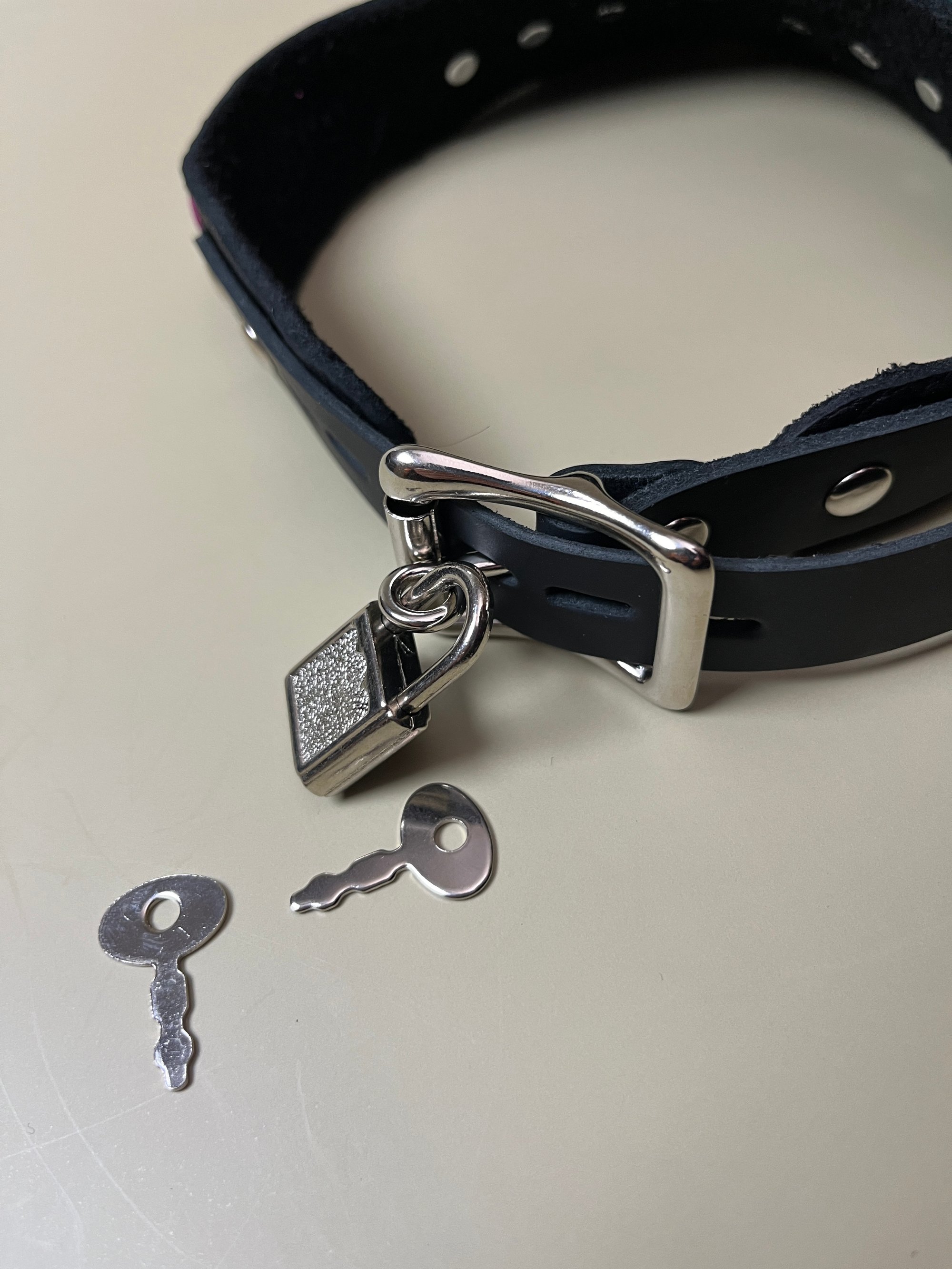 This beautiful, soft leather collar is black textured leather under smooth purple. It has a silver locking buckle and comes with a small lock and two keys. The ring and the rivet decorations are rainbow metal. So pretty! Fits necks 13 1/2 inches up to 16 inches.